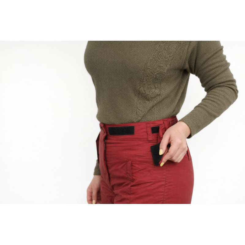 Женские утепленные брюки с высокой посадкой регулируются липучкой и пластиковыми застежками. Застегиваются на молнию, имеют два глубоких кармана. Высокий пояс и спинка не только подчеркивают талию, но и защищают поясницу.Верх из водоотталкивающей тк ани Dewspo, внутри - синтепон, подкладка из полиэстера.
