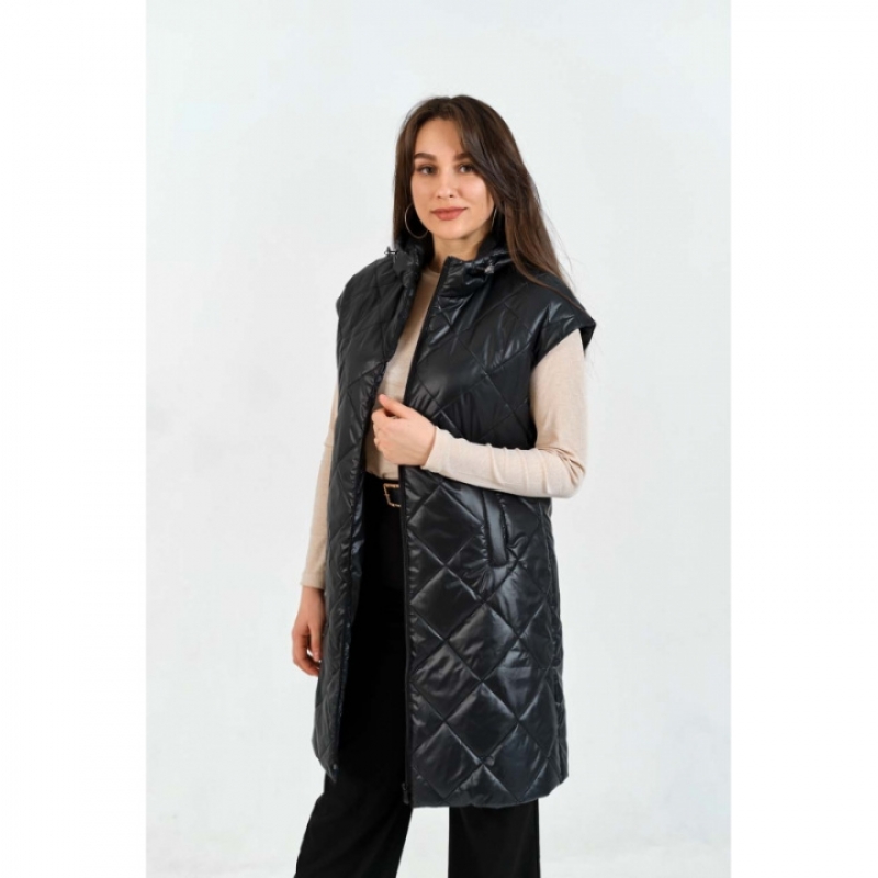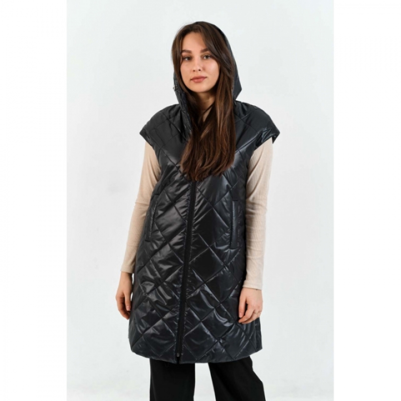 Женский удлиненный жилет с капюшоном и короткими рукавами из курточной ткани с влагоотталкивающей пропиткой и утеплителем синтепоном 100 г/м². Подкладка — Taffeta 190 PU. Центральная застежка — молния, два кармана в листочку. Длина жилета — 80 см